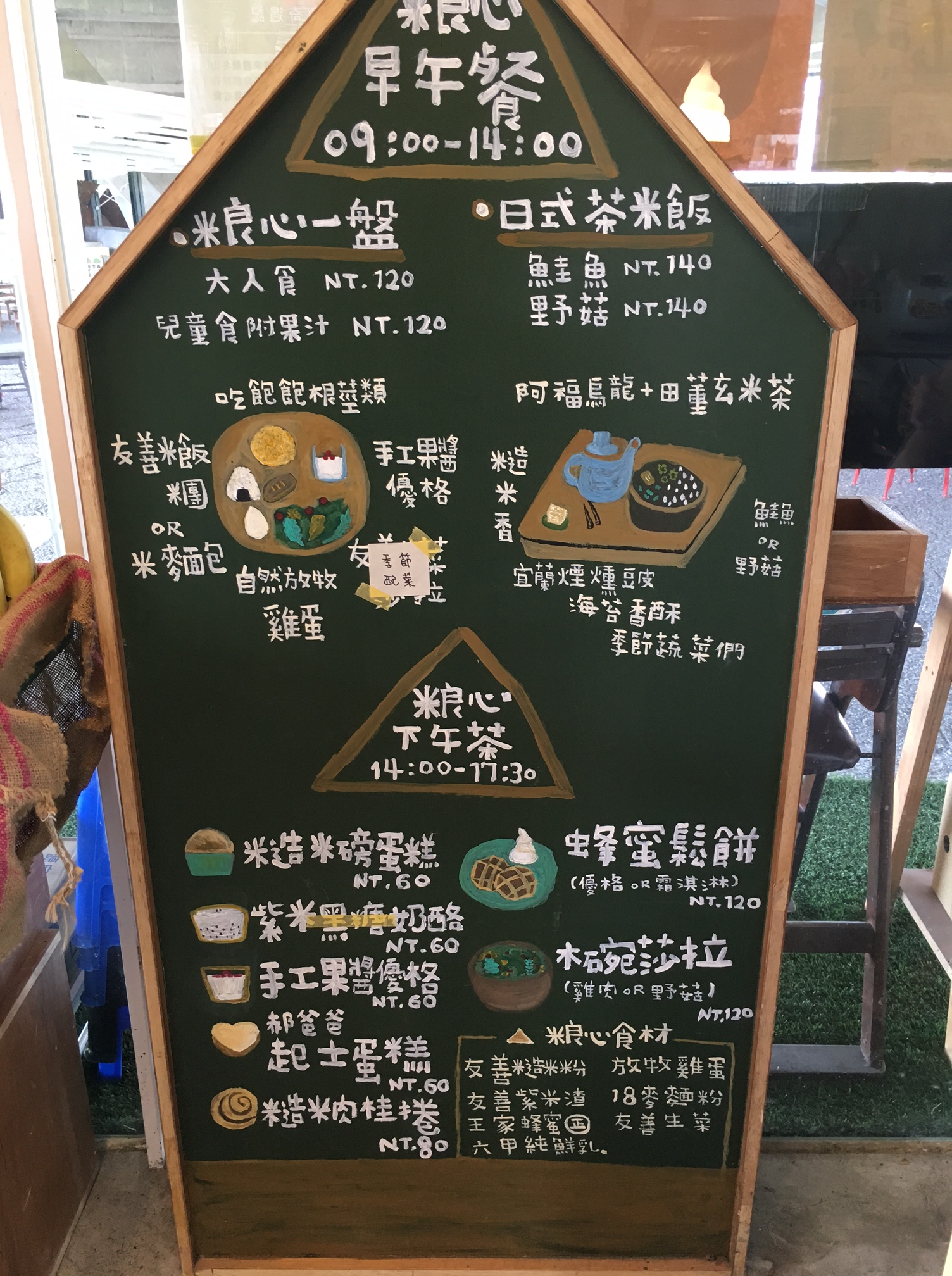 - 午餐:不開車可以就近在冬山簡單的吃頓午餐,在地人推薦愛吃的小吃,雖然用餐環境一般就是一個小吃店的概念『冬山小可愛』,可點米粉羹/臭豆腐/粉圓冰 。如果太餓不想多走路,就在火車站下的小農市集『粮心聚落』吃沙拉/茶米飯,店員是個友善的年輕人,帶點放養雞蛋或是新鮮蔬菜回家也很好。上次去,他跟我聊放養雞蛋就聊得很開心,雞是養來吃果園雜草的,會自然老死,不打針。再去冬山市場內的『飛魚食染鹽滷豆花專賣舖』吃豆花,喝豆槳,吃枝仔冰。